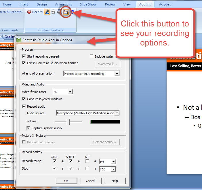When you first install Camtasia Studio, it will automatically install a toolbar in Powerpoint.