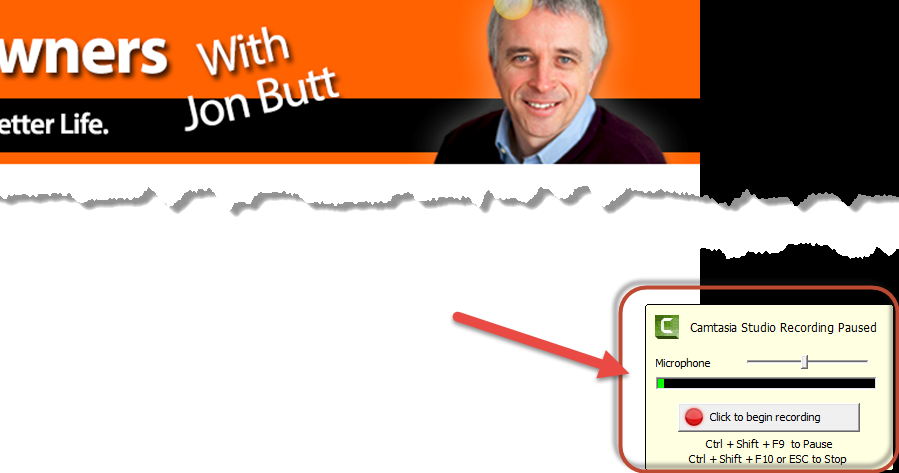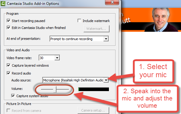 The recording will start as ‘paused’ so this is a good time to check your microphone levels again. If you need to adjust the volume level, you can do so in this little window.